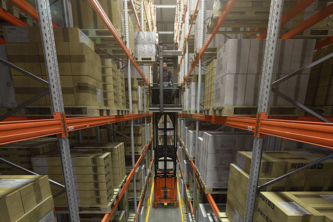 - High-level order picking and full pallet handling in wire or rail-guided aisles